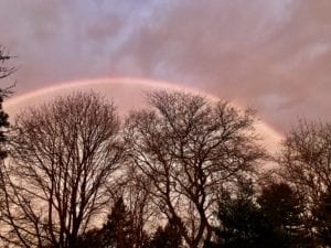 I got up to do my morning bathroom routine and from the toilet throne I looked out the window and thought I saw part of a rainbow. I quickly got up, ran outside in my pajamas and stood in my driveway in awe as the rain gently drizzled down on my face. Behold! A full blown rainbow arching above the trees framing my yard. Rainbows are significant for me which I will share in my second book.
